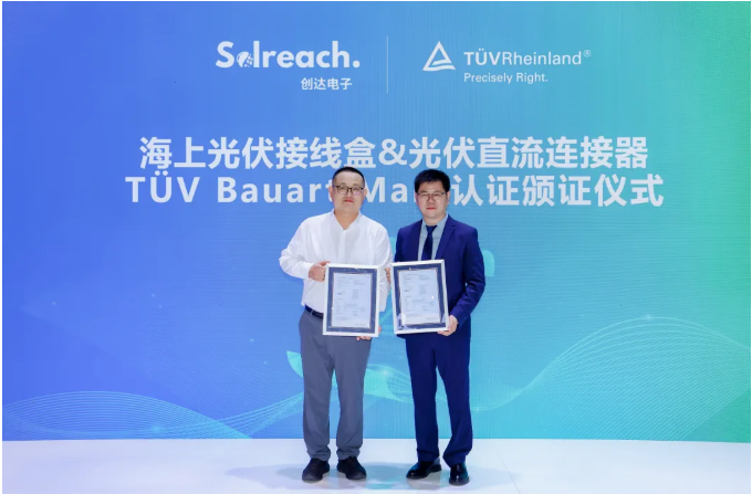 TüV萊茵為泰州創(chuàng)達(dá)海上光伏接線盒和海上光伏直流連接器頒發(fā)TüV Bauart Mark型式認(rèn)證證書